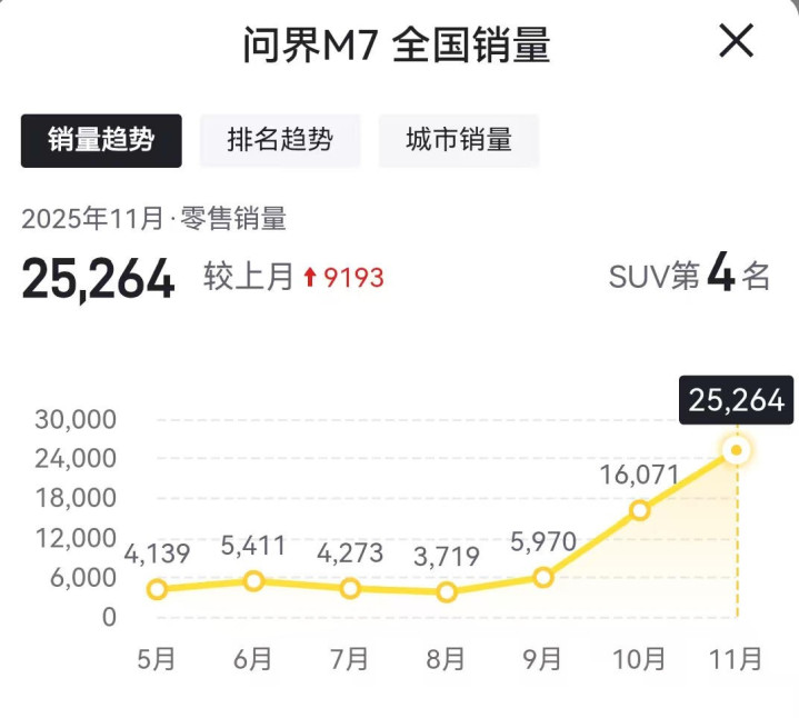 首先是问界M7。这款车在9月23日上市,9月26日才正式开启交付,属于是准新车了。而在11月份,问界M7也是一口气交出了25264辆新车的销量成绩单,比10月份交付的16071辆新车,又上涨9193辆,这真让人所没有想到。