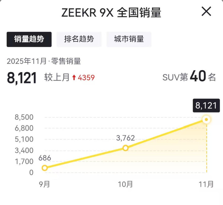 最后是极氪9X。这款车在9月29日上市,售价46.59-59.99万元,整体定价和问界M9处在一个价位区间。10月份,极氪9X的销量还只有3762辆,而来到11月份,其销量数据却攀升到了8121辆,等于说11月销量上涨了4359辆,涨幅确实挺大的。另外别忘了,极氪9X还是一款起售价近46万的大型SUV,那这么多人买它到底图啥呢?
