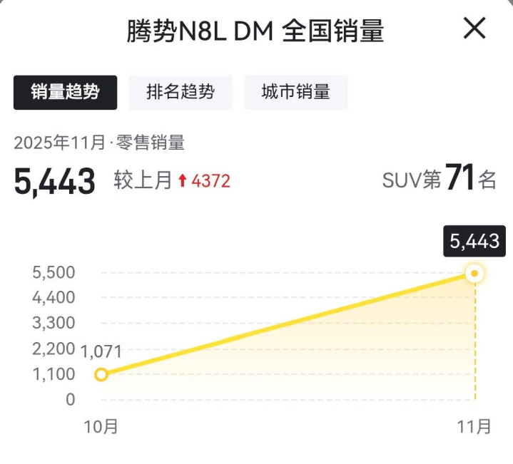 其次是腾势N8L。作为腾势N9的“小号版本”,腾势N8L在10月28日上市,新车售价29.98-32.98万元,相较于此前上市的腾势N9,整体价格便宜不少,这也是其之所以能够热销的关键。11月份,腾势N8L一共交付了5443辆新车,作为上市后的首个完整交付月份,能取得这样的成绩也还是不错的。